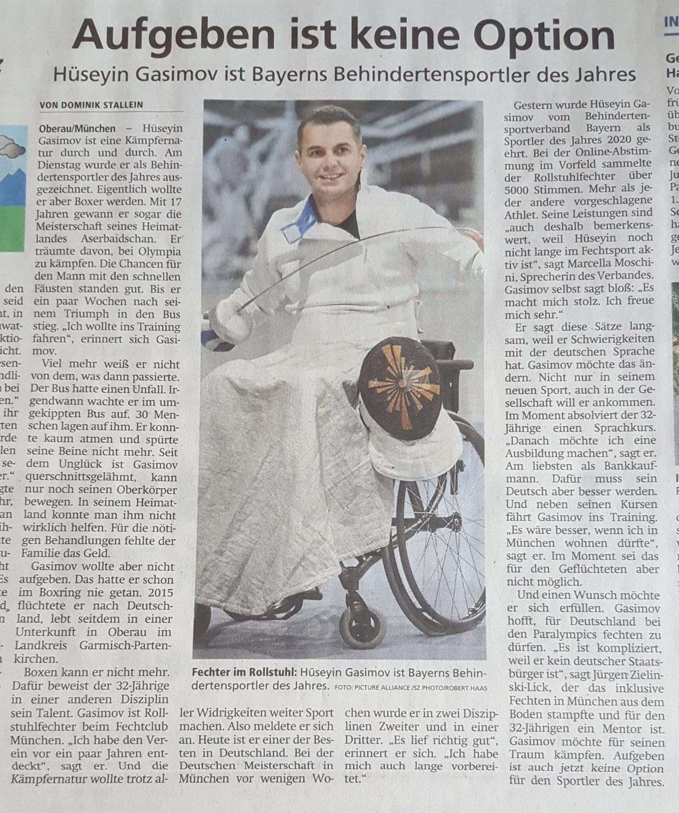 Fechter im Rollstuhl: Hüseyin Gasimov ist Bayerns Behindertensportler des Jahres.