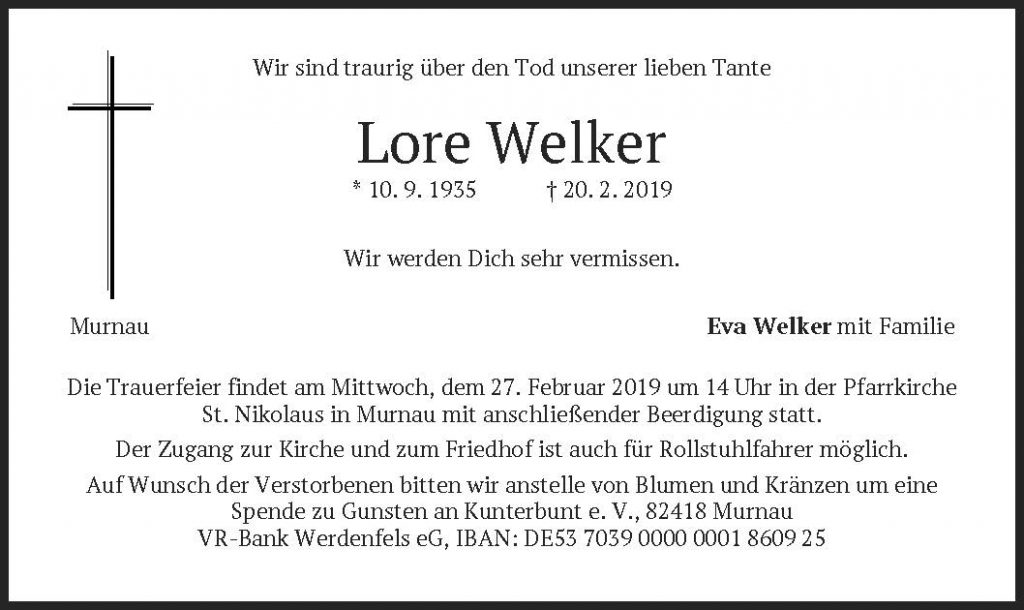 Eine Stimme der behinderten Menschen ist verstummt. Lore Welker, Gründungsmitglied des RSV und frühere Murnauer Gemeinderätin stirbt mit 83 Jahren. Sie saß rund 55 Jahre im Rollstuhl nach einem Bergunfall.