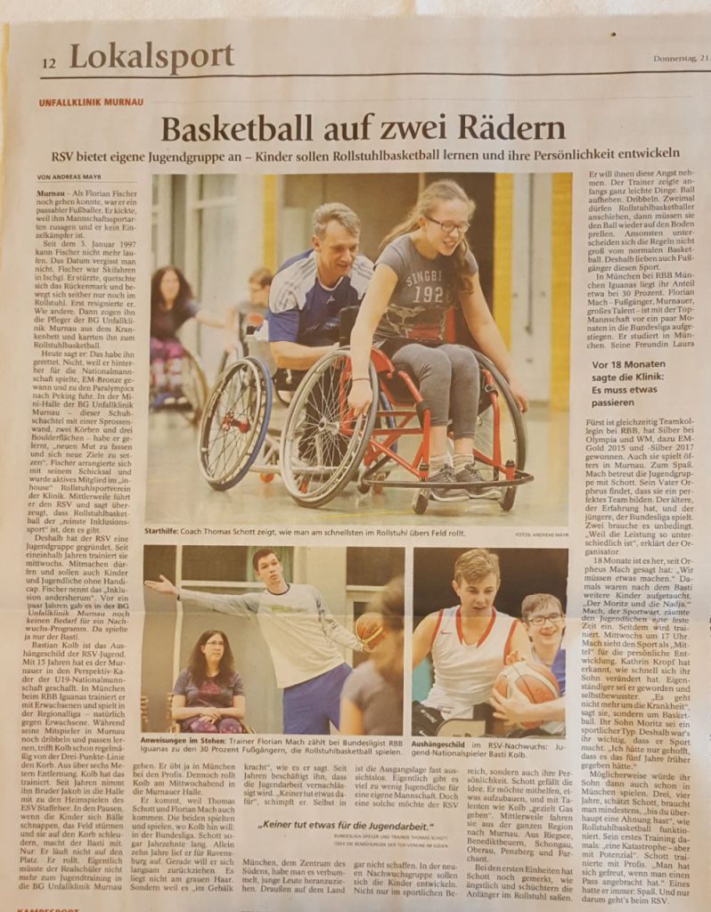 Der RSV Murnau ruft das Jugendförderkonzept Rollstuhlbasketball ins Leben. Um dem ansteigenden Anteil an Jugendlichen und jungen Erwachsenen im RSV Murnau den Einstieg und die Weiterentwicklung in den Rollstuhlsport zu ermöglichen, ist ein Förderkonzept genannt „Jugendförderkonzept“ etabliert worden. Gefördert werden im „Jugendfördertraining“ neben Mitgliedern des Vereins temporär auch geeignete und interessierte Patienten sowie Praktikanten der BG Unfallklinik Murnau. Die Inhalte des Jugendfördertrainings werden an Hand der Sportart Rollstuhlbasketball entwickelt.