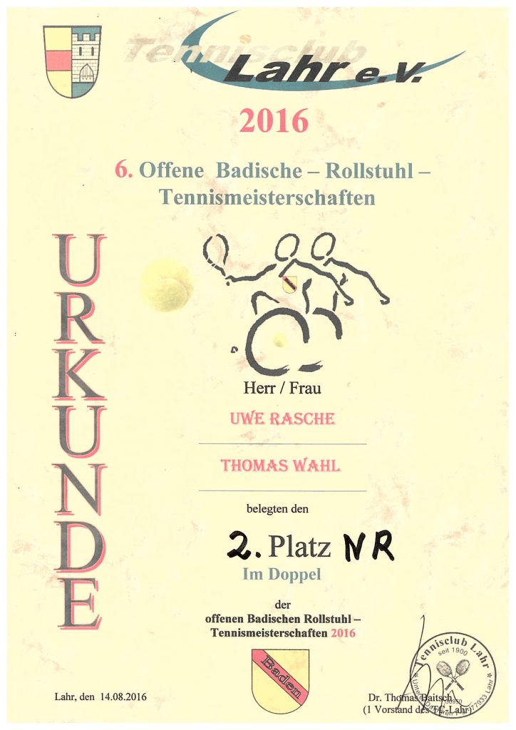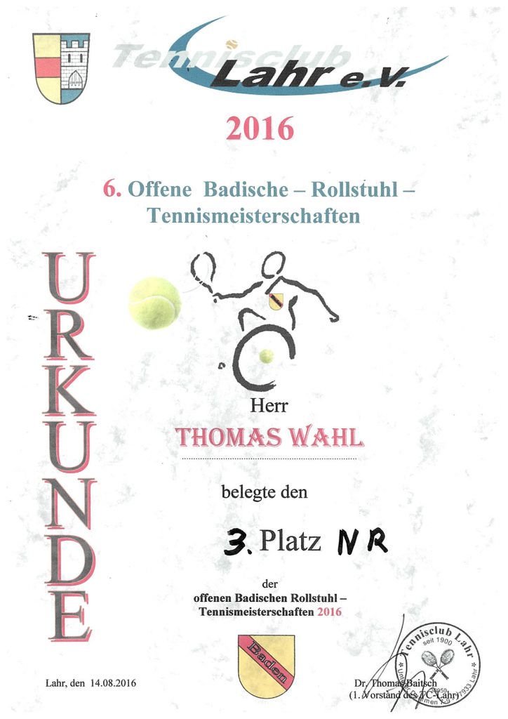 Thomas Wahl nahm am 13. und 14. August an den offenen Badischen Meisterschaften im Rollstuhltennis teil. Er belegte den 3. Platz im Einzel und den 2. Platz im Doppel
